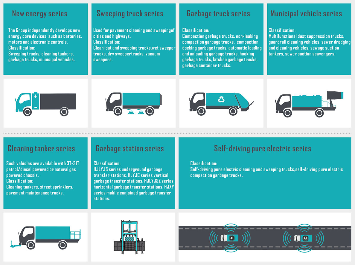 It mainly produces two major categories of sanitation special-purpose vehicle products, namely, road cleaning and garbage collection, and has developed more than 160 models of various types of sanitation special-purpose vehicles, including more than 30 models of new energy and pure electric products, covering the three major categories of fuel oil, natural gas, and pure electric, and comprising 18 product series, with a complete assortment of varieties.
